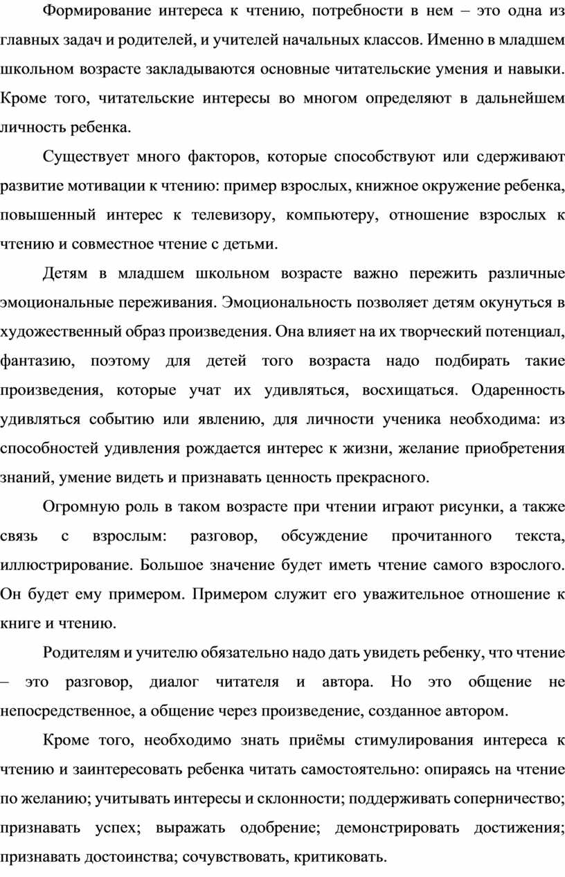 Кроме того, необходимо знать приёмы стимулирования интереса к чтению и заинтересовать ребенка читать самостоятельно: опираясь на чтение по желанию; учитывать интересы и склонности; поддерживать соперничество; признавать успех; выражать одобрение; демонстрировать достижения; признавать достоинства; сочувствовать, критиковать.