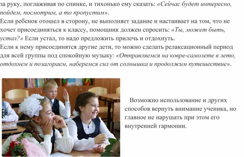 Если ребенок отвлекся, но при этом не мешает другим (отошел в сторону и не выполняет задание), помощник педагога может попытаться его заинтересовать, взять за руку, поглаживая по спинке, и тихонько ему сказать: «Сейчас будет интересно, пойдем, посмотрим, а то пропустим».