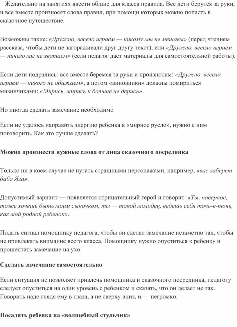 Желательно на занятиях ввести общие для класса правила. Все дети берутся за руки, и все вместе произносят слова правил, при помощи которых можно попасть в сказочное путешествие.