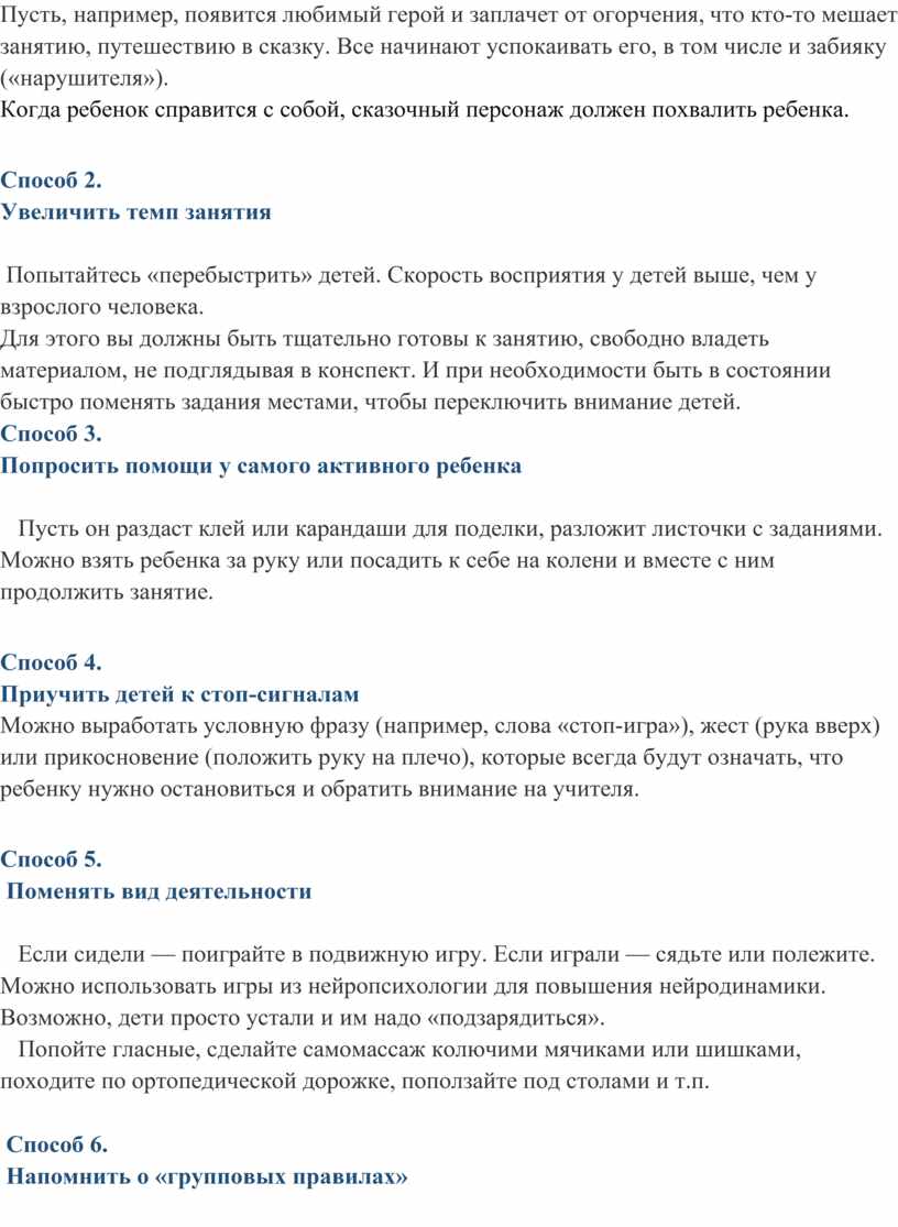Можно выработать условную фразу (например, слова «стоп-игра»), жест (рука вверх) или прикосновение (положить руку на плечо), которые всегда будут означать, что ребенку нужно остановиться и обратить внимание на учителя.