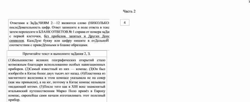 (1)Большинство великих географических открытий стало возможным благодаря использованию особых навигационных приборов. (2)Самый известный из них — компас. (З)Он был изобретён в Китае более двух тысяч лет назад. (4)Пластинка из магнитного железняка в этом компасе указывала не на север (как мы привыкли), а на юг, поэтому в Китае компас называли «ведающий югом». (5)После того как в XIII веке знаменитый итальянский путешественник Марко Поло привёз в Европу компас, европейцы сами начали изготавливать этот полезный прибор. |