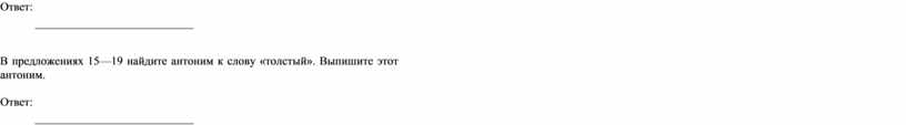 В предложениях 15—19 найдите антоним к слову «толстый». Выпишите этот антоним.