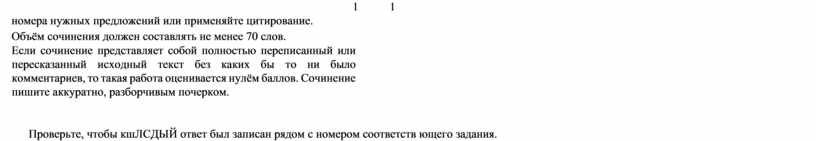 Если сочинение представляет собой пересказанный или полностью переписанный исходный текст без каких бы то ни было комментариев, то такая работа оценивается нулём баллов. Сочинение пишите аккуратно, разборчивым почерком.