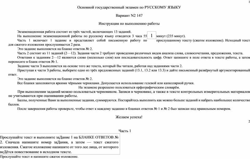 Часть 1 включает 1 задание и представляет собой письменную работу по прослушанному тексту (сжатое изложение). Исходный текст для сжатого изложения прослушивается 2 раза.