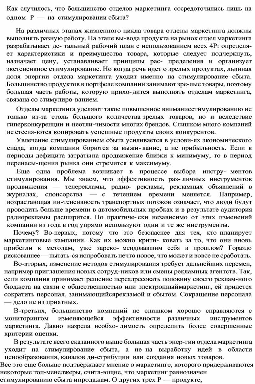 В результате всего сказанного выше большая часть энер гии отдела маркетинга уходит на стимулирование сбыта, а не на выработку идей в области ценообразования, каналов ди стрибуции или создания новых товаров.