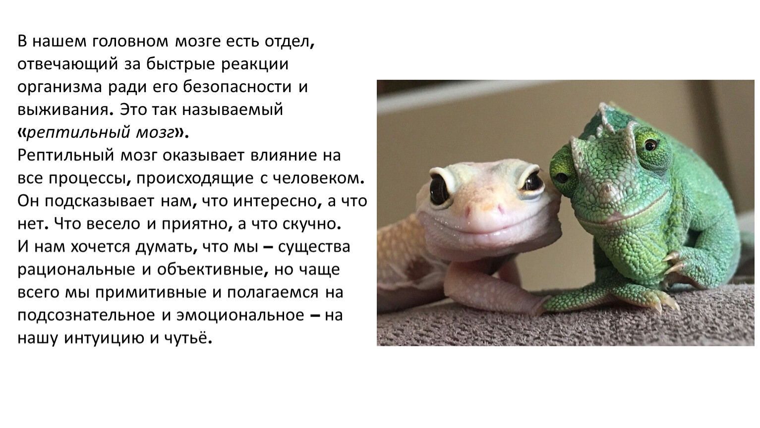 В нашем головном мозге есть отдел, отвечающий за быстрые реакции организма ради его безопасности и выживания. Это так называемый «рептильный мозг».