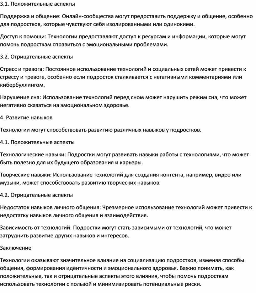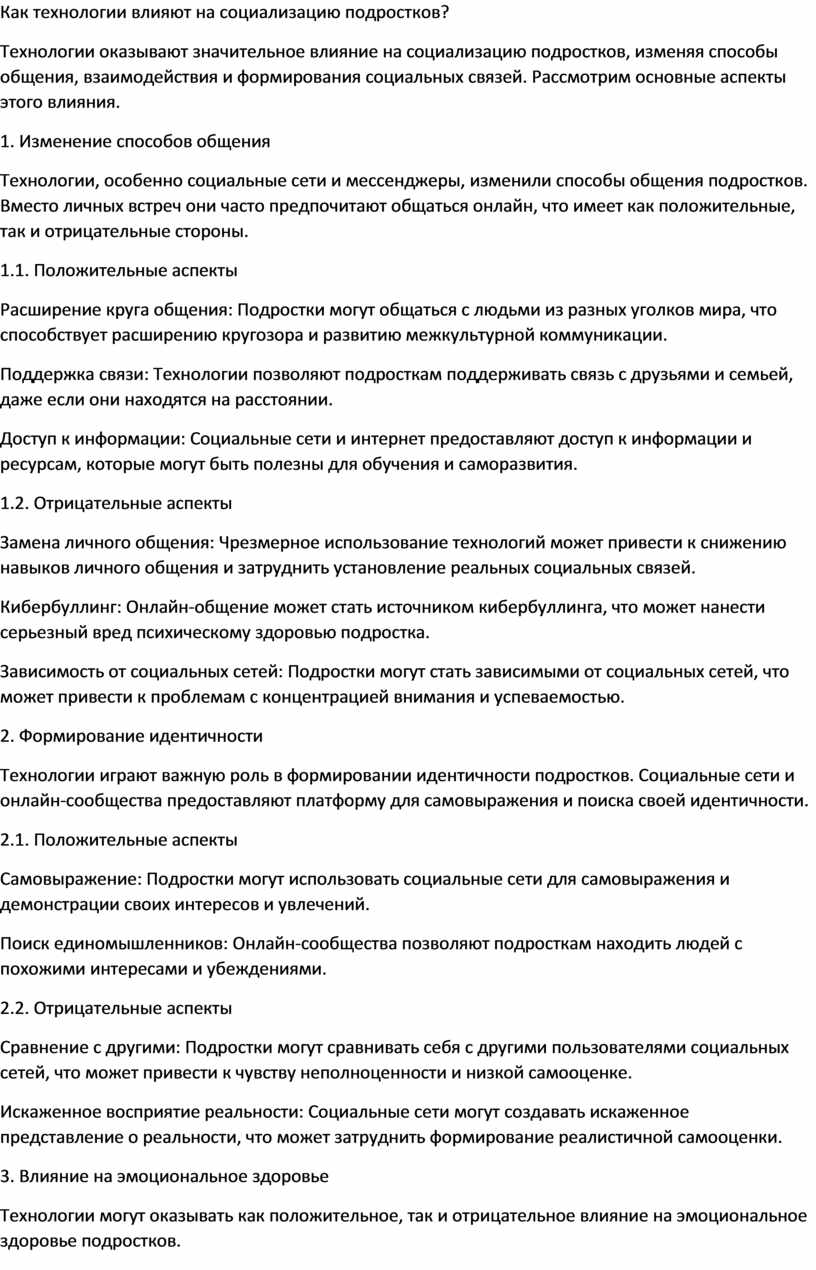 Технологии оказывают значительное влияние на социализацию подростков, изменяя способы общения, формирования идентичности и эмоционального здоровья. Важно понимать, как положительные, так и отрицательные аспекты этого влияния, чтобы помочь подросткам использовать технологии с пользой и минимизировать потенциальные риски.