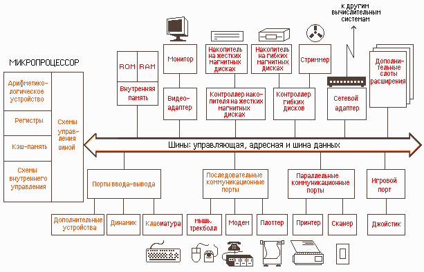 Каждый из функциональных элементов (память, монитор или другое устройство) связан с шиной определённого типа — адресной, управляющей или шиной данных.