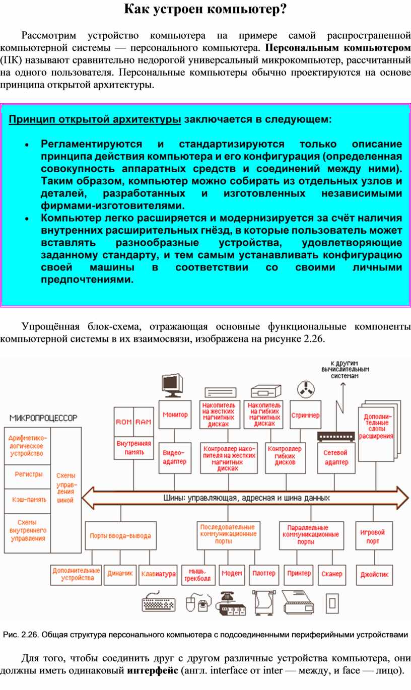 Рассмотрим устройство компьютера на примере самой распространенной компьютерной системы — персонального компьютера. Персональным компьютером (ПК) называют сравнительно недорогой универсальный микрокомпьютер, рассчитанный на одного пользователя. Персональные компьютеры обычно проектируются на основе принципа открытой архитектуры.