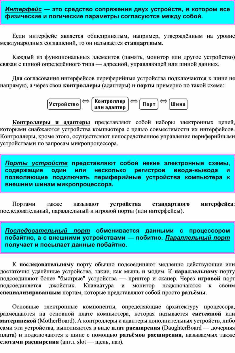 Для того, чтобы соединить друг с другом различные устройства компьютера, они должны иметь одинаковый интерфейс (англ. interface от inter — между, и face — лицо).