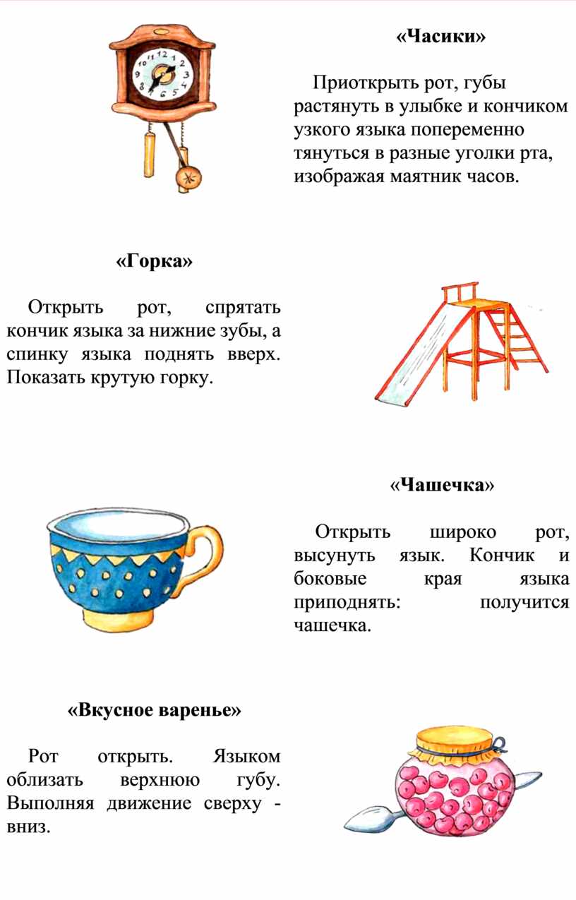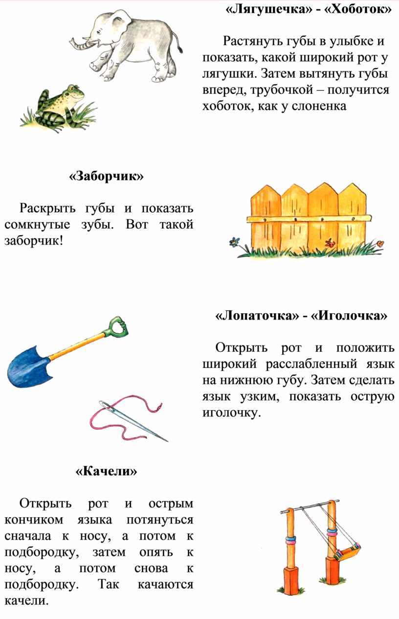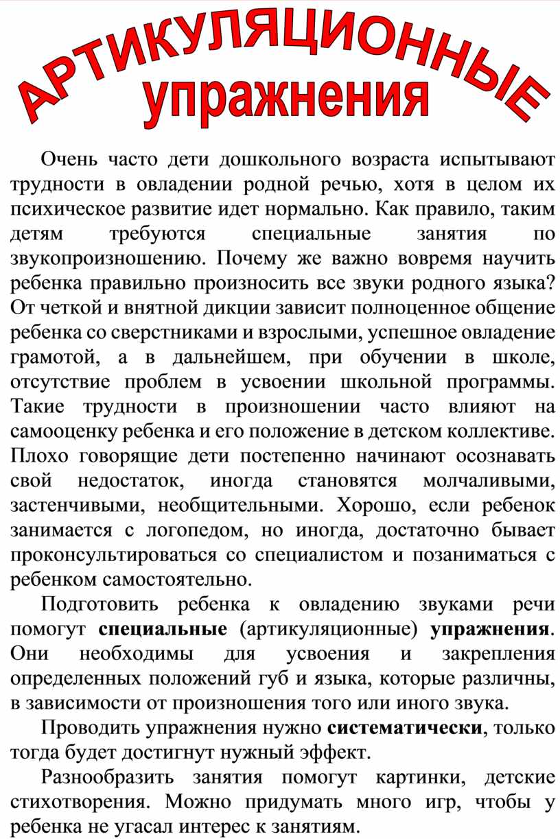 Подготовить ребенка к овладению звуками речи помогут специальные (артикуляционные) упражнения. Они необходимы для усвоения и закрепления определенных положений губ и языка, которые различны, в зависимости от произношения того или иного звука.