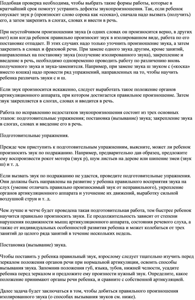 Подобная проверка необходима, чтобы выбрать такие формы работы, которые в кратчайший срок помогут устранить дефекты звукопроизношения. Так, если ребенок опускает звук р (произносит слово сорока как «соока»), сначала надо вызвать (получить) его, а затем закрепить в слогах, словах и ввести в речь.