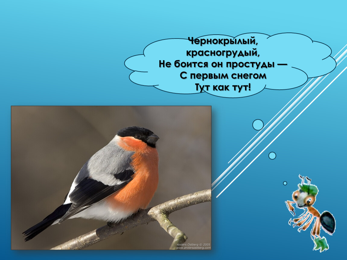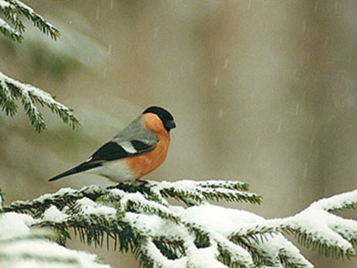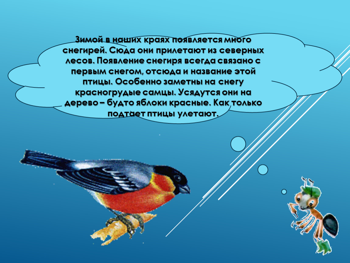 Зимой в наших краях появляется много снегирей. Сюда они прилетают из северных лесов. Появление снегиря всегда связано с первым снегом, отсюда и название этой птицы. Особенно заметны на снегу красногрудые самцы. Усядутся они на дерево – будто яблоки красные. Как только подтает птицы улетают.