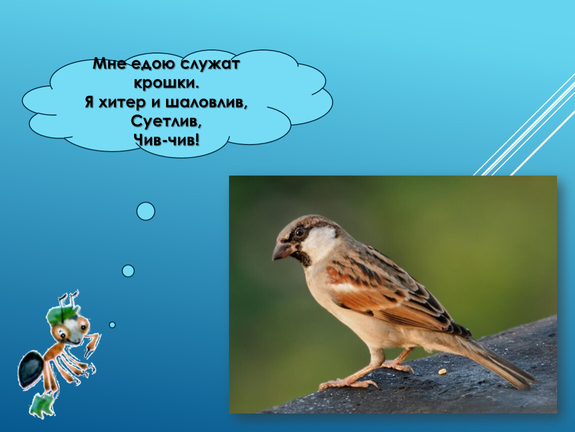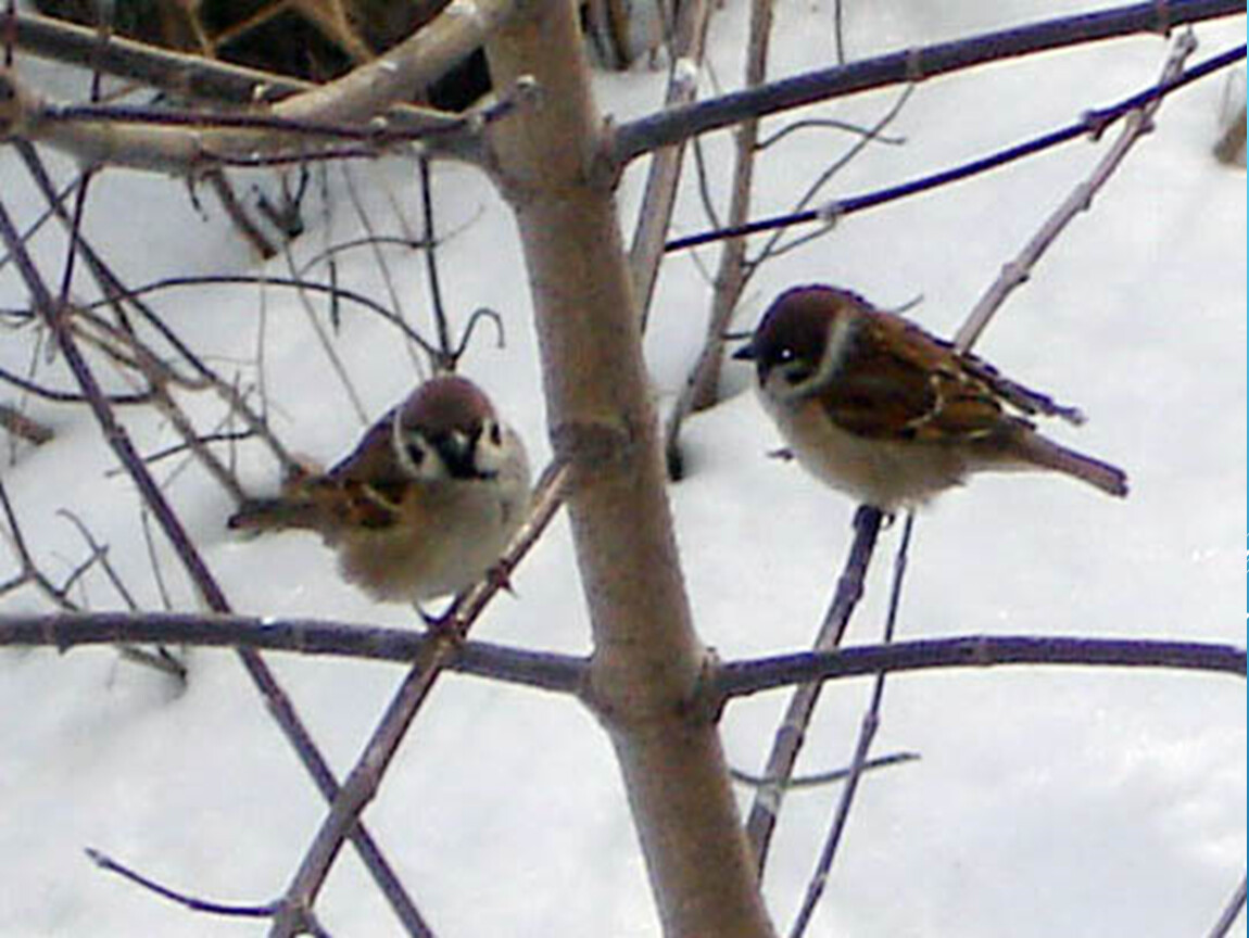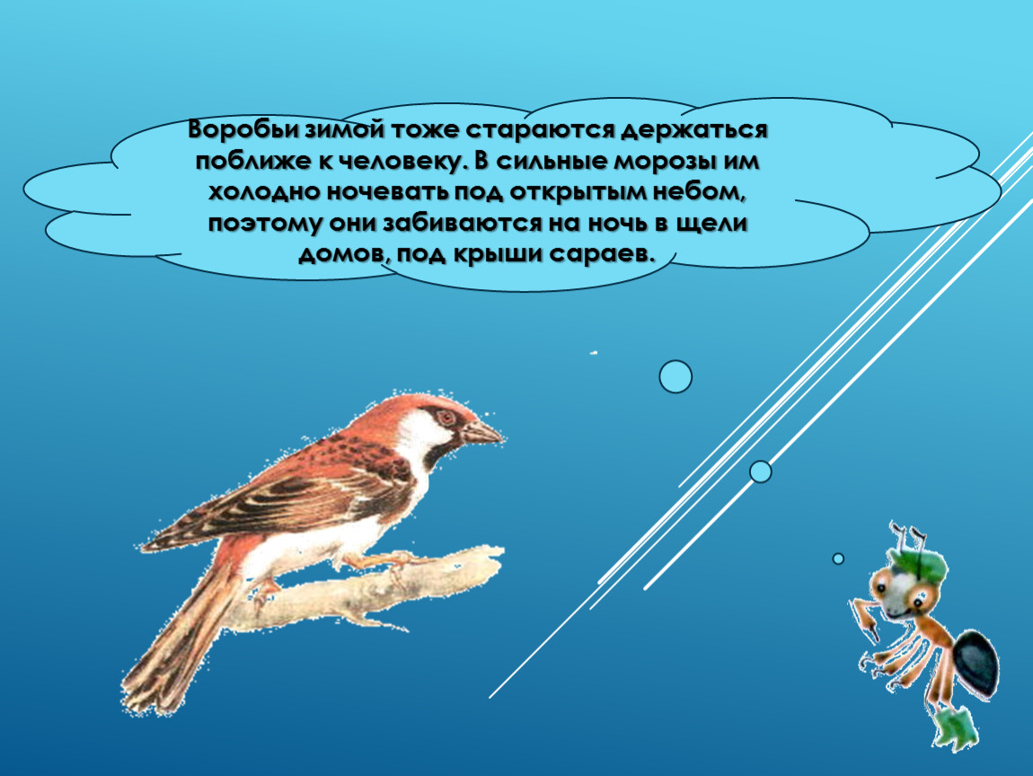 Воробьи зимой тоже стараются держаться поближе к человеку. В сильные морозы им холодно ночевать под открытым небом, поэтому они забиваются на ночь в щели домов, под крыши сараев.