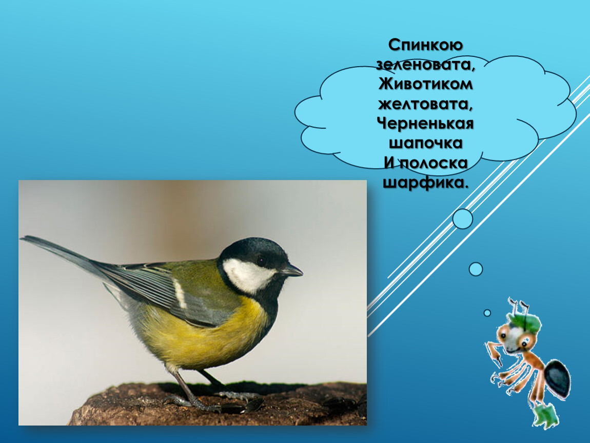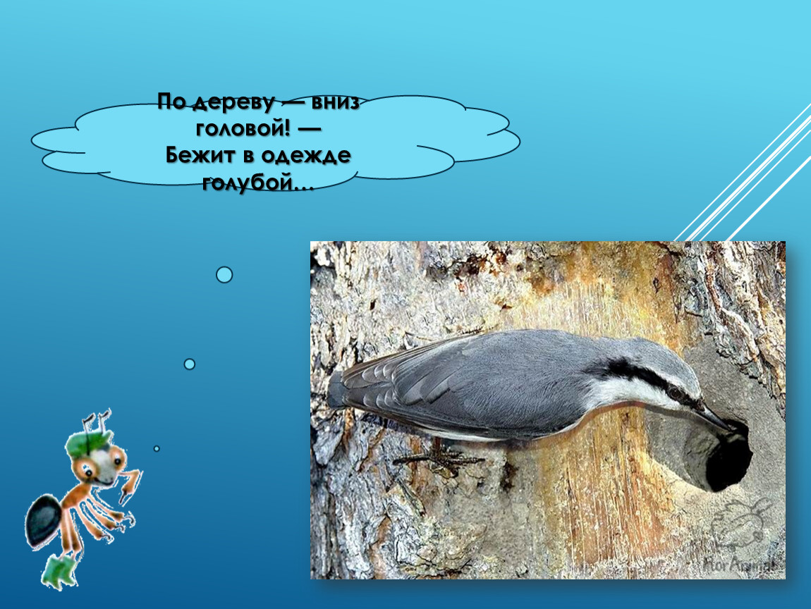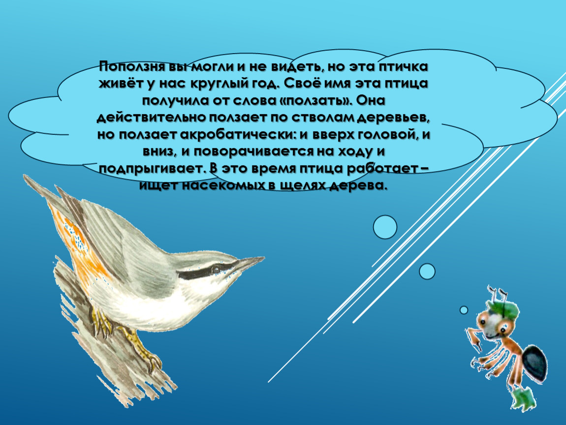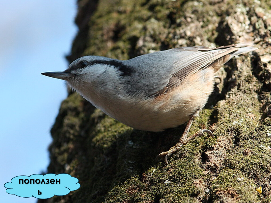 Поползня вы могли и не видеть, но эта птичка живёт у нас круглый год. Своё имя эта птица получила от слова «ползать». Она действительно ползает по стволам деревьев, но ползает акробатически: и вверх головой, и вниз, и поворачивается на ходу и подпрыгивает. В это время птица работает – ищет насекомых в щелях дерева.