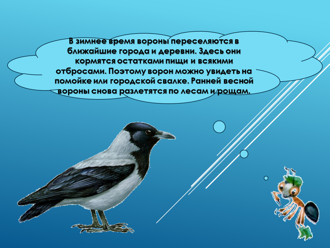 В зимнее время вороны переселяются в ближайшие города и деревни. Здесь они кормятся остатками пищи и всякими отбросами. Поэтому ворон можно увидеть на помойке или городской свалке. Ранней весной вороны снова разлетятся по лесам и рощам.