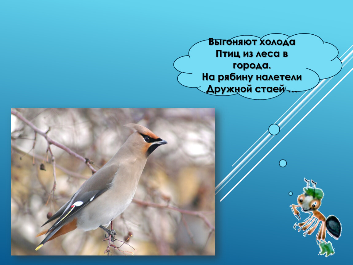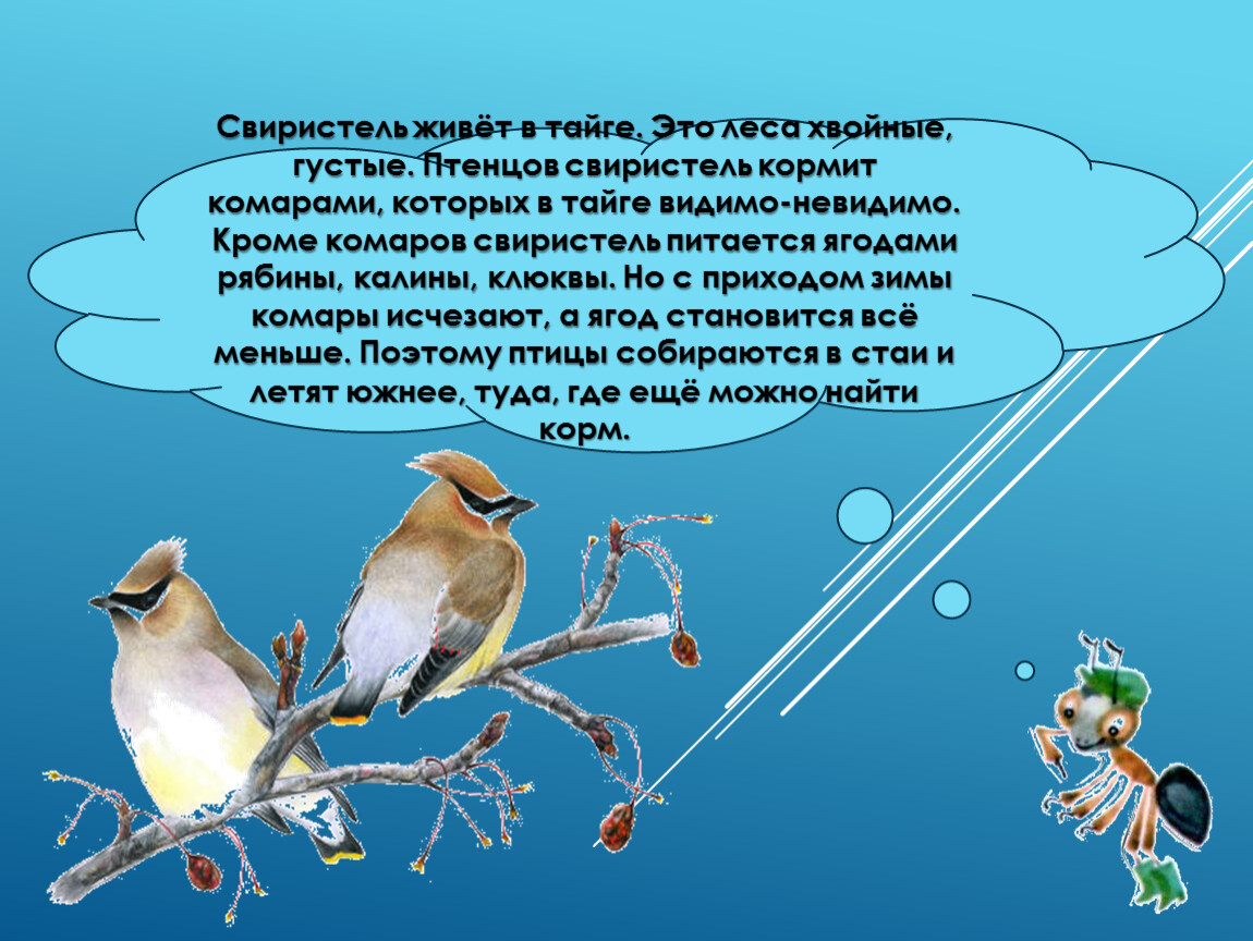 Свиристель живёт в тайге. Это леса хвойные, густые. Птенцов свиристель кормит комарами, которых в тайге видимо-невидимо. Кроме комаров свиристель питается ягодами рябины, калины, клюквы. Но с приходом зимы комары исчезают, а ягод становится всё меньше. Поэтому птицы собираются в стаи и летят южнее, туда, где ещё можно найти корм.