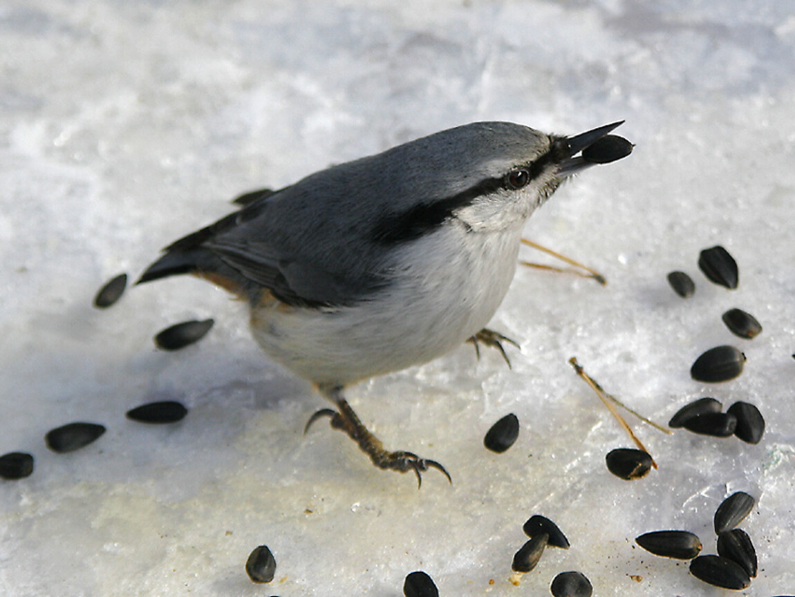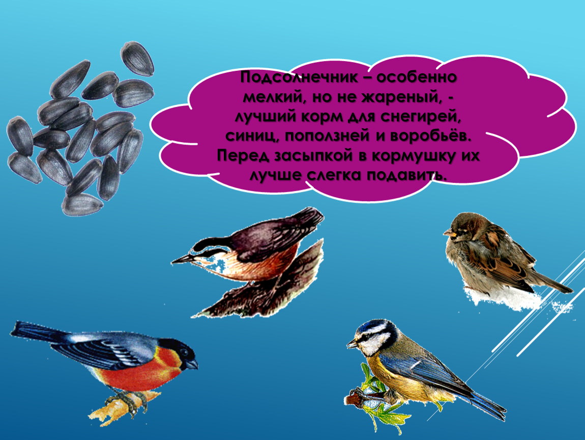 Подсолнечник – особенно мелкий, но не жареный, - лучший корм для снегирей, синиц, поползней и воробьёв. Перед засыпкой в кормушку их лучше слегка подавить.