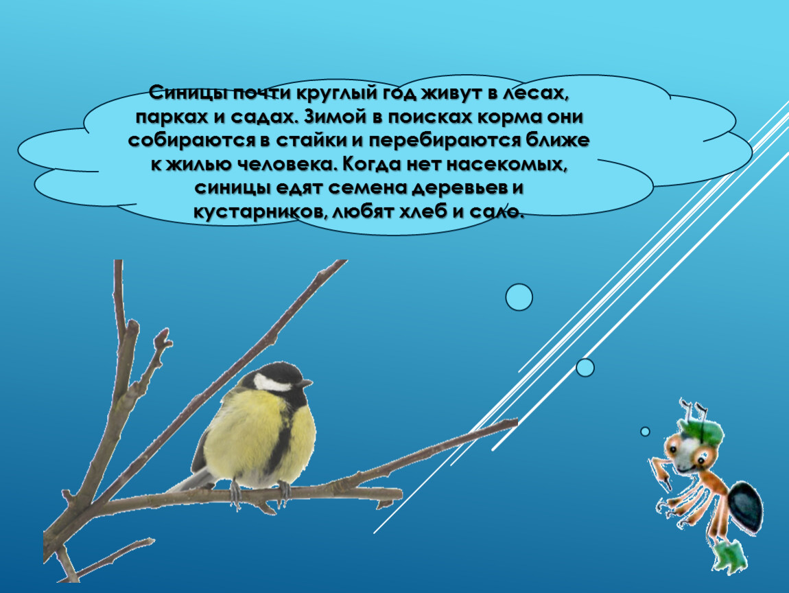 Синицы почти круглый год живут в лесах, парках и садах. Зимой в поисках корма они собираются в стайки и перебираются ближе к жилью человека. Когда нет насекомых, синицы едят семена деревьев и кустарников, любят хлеб и сало.