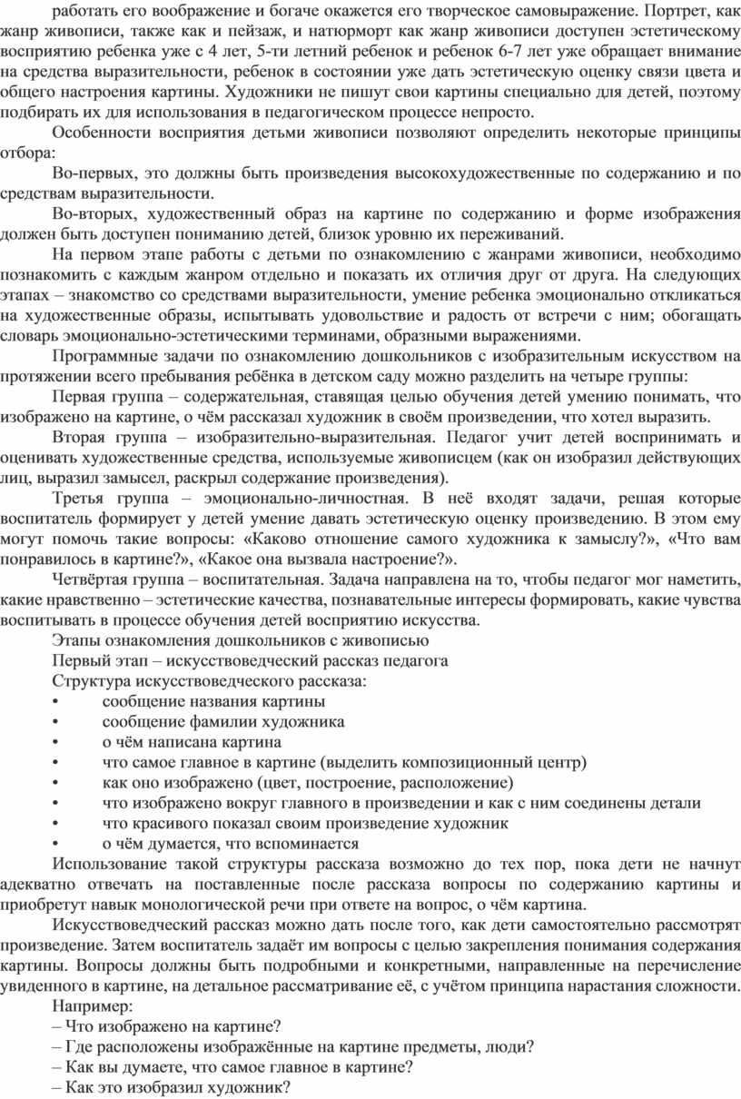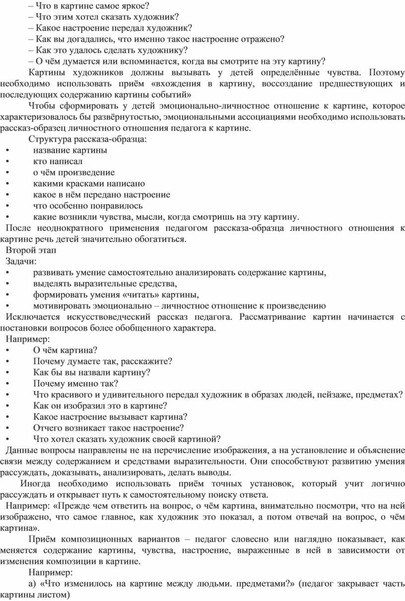 Исключается искусствоведческий рассказ педагога. Рассматривание картин начинается с постановки вопросов более обобщенного характера.