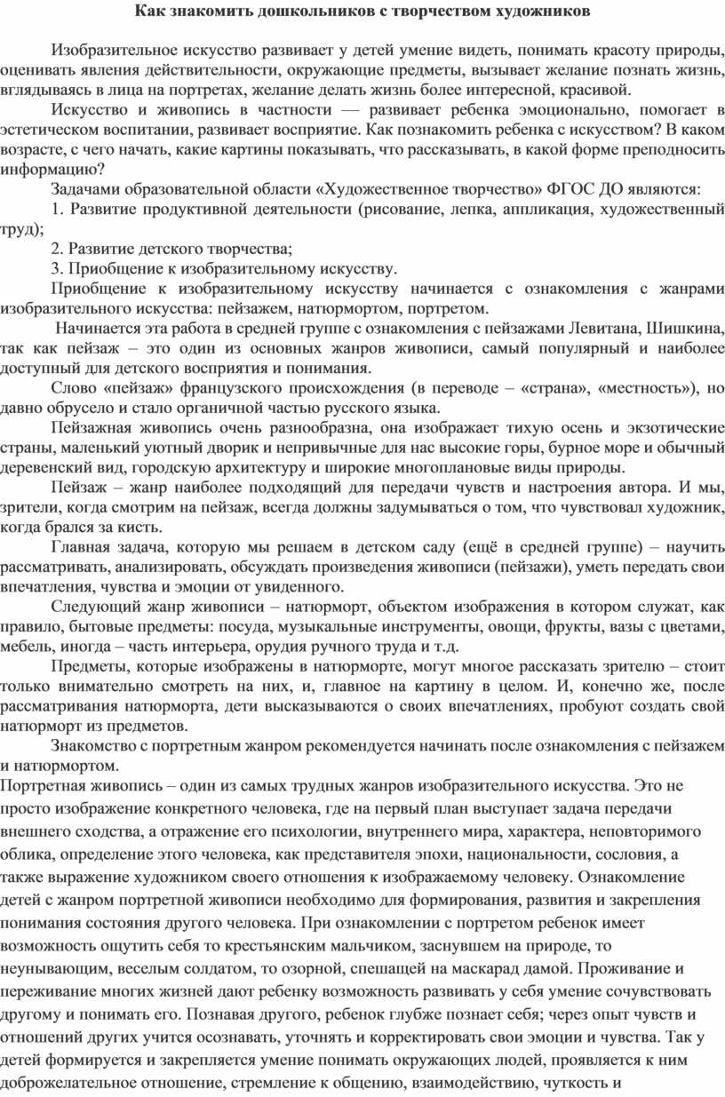Приобщение к изобразительному искусству начинается с ознакомления с жанрами изобразительного искусства: пейзажем, натюрмортом, портретом.