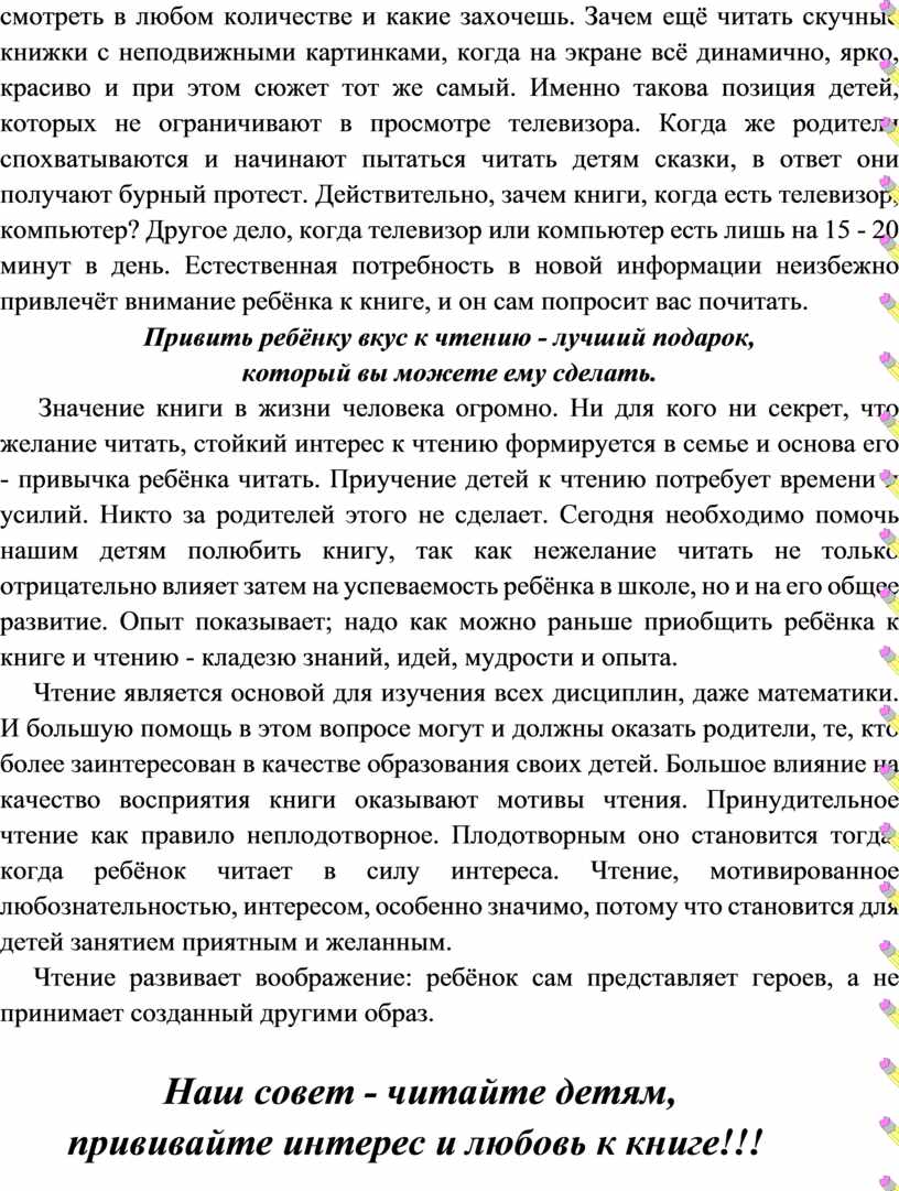 Значение книги в жизни человека огромно. Ни для кого ни секрет, что желание читать, стойкий интерес к чтению формируется в семье и основа его - привычка ребёнка читать. Приучение детей к чтению потребует времени и усилий. Никто за родителей этого не сделает. Сегодня необходимо помочь нашим детям полюбить книгу, так как нежелание читать не только отрицательно влияет затем на успеваемость ребёнка в школе, но и на его общее развитие. Опыт показывает; надо как можно раньше приобщить ребёнка к книге и чтению - кладезю знаний, идей, мудрости и опыта.