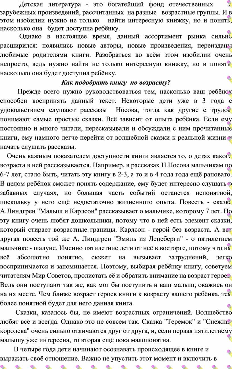 Детская литература - это богатейший фонд отечественных и зарубежных произведений, рассчитанных на разные возрастные группы. И в этом изобилии нужно не только найти интересную книжку, но и понять, насколько она будет доступна ребёнку.