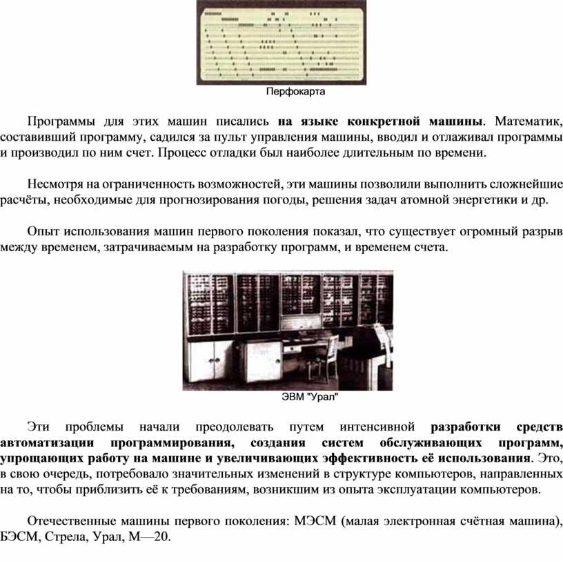 Отечественные машины первого поколения: МЭСМ (малая электронная счётная машина), БЭСМ, Стрела, Урал, М—20.