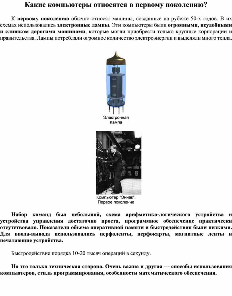 К первому поколению обычно относят машины, созданные на рубеже 50-х годов. В их схемах использовались электронные лампы. Эти компьютеры были огромными, неудобными и слишком дорогими машинами, которые могли приобрести только крупные корпорации и правительства. Лампы потребляли огромное количество электроэнергии и выделяли много тепла.