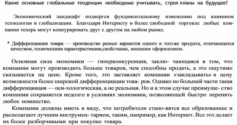 Экономический ландшафт подвергся фундаментальному изменению под влиянием технологии и глобализации. Благодаря Интернету и более свободной торговле любые ком пании теперь могут конкурировать друг с другом на любом рынке.