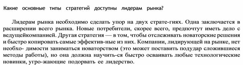 Лидерам рынка необходимо сделать упор на двух страте гиях. Одна заключается в расширении всего рынка. Новые потребители, скорее всего, предпочтут иметь дело с ведущей компанией. Другая стратегия — в том, чтобы отслеживать новаторские решения и быстро копировать самые эффектив ные из них. Компании, лидирующей на рынке, нет необхо димости заниматься новаторством (это может поставить под удар сложившиеся методы работы), но она должна научить ся быстро осваивать любые технологические новинки, угро жающие подорвать ее лидерство.
