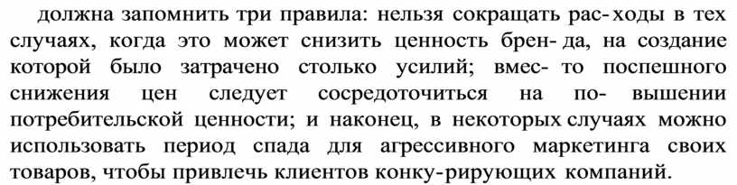 Стремясь как можно быстрее принять все эти меры, ком пания должна запомнить три правила: нельзя сокращать рас ходы в тех случаях, когда это может снизить ценность брен да, на создание которой было затрачено столько усилий; вмес то поспешного снижения цен следует сосредоточиться на по вышении потребительской ценности; и наконец, в некоторых случаях можно использовать период спада для агрессивного маркетинга своих товаров, чтобы привлечь клиентов конку рирующих компаний.