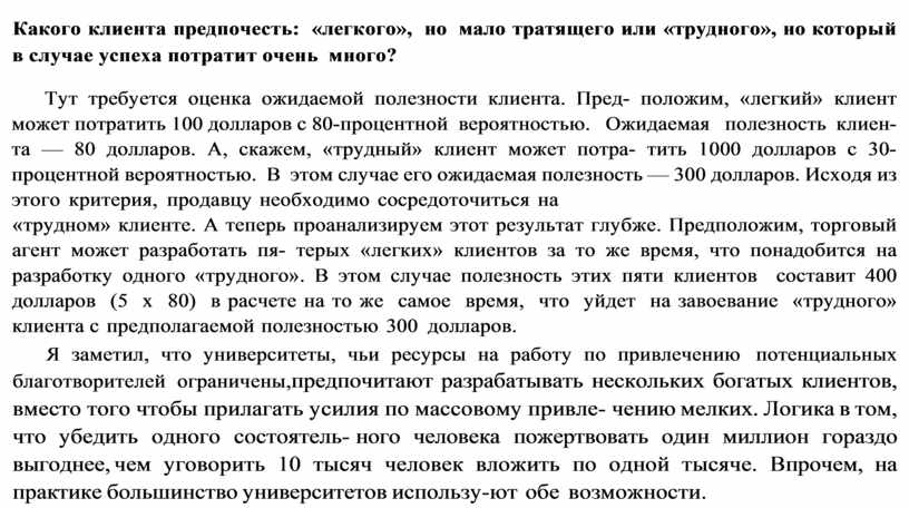Какого клиента предпочесть: «легкого», но мало тратящего или «трудного», но который в случае успеха потратит очень много?