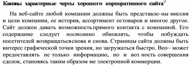На веб-сайте любой компании должны быть представле ны миссия и цели компании, ее история, ассортимент ее товаров и многое другое. Сайт должен давать возможность прямого контакта с компанией. Его содержание следует постоянно обновлять, чтобы побуждать посетителей возвращаться снова и снова. Страницы сайта должны быть интерес графической точки зрения, но загружаться быстро. Вео~ может предоставлять не только информацию, но и воз ность совершения сделок, становясь таким образом ме электронной коммерции.