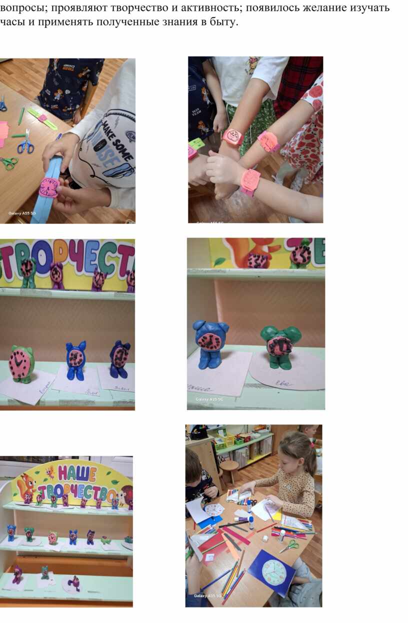 Результат : У детей сформированы первоначальные знания о часах, времени. Заинтересованность детей темой. Дети самостоятельно проявляют инициативу: рассматривают иллюстрации, участвуют в играх, задают вопросы; проявляют творчество и активность; появилось желание изучать часы и применять полученные знания в быту.