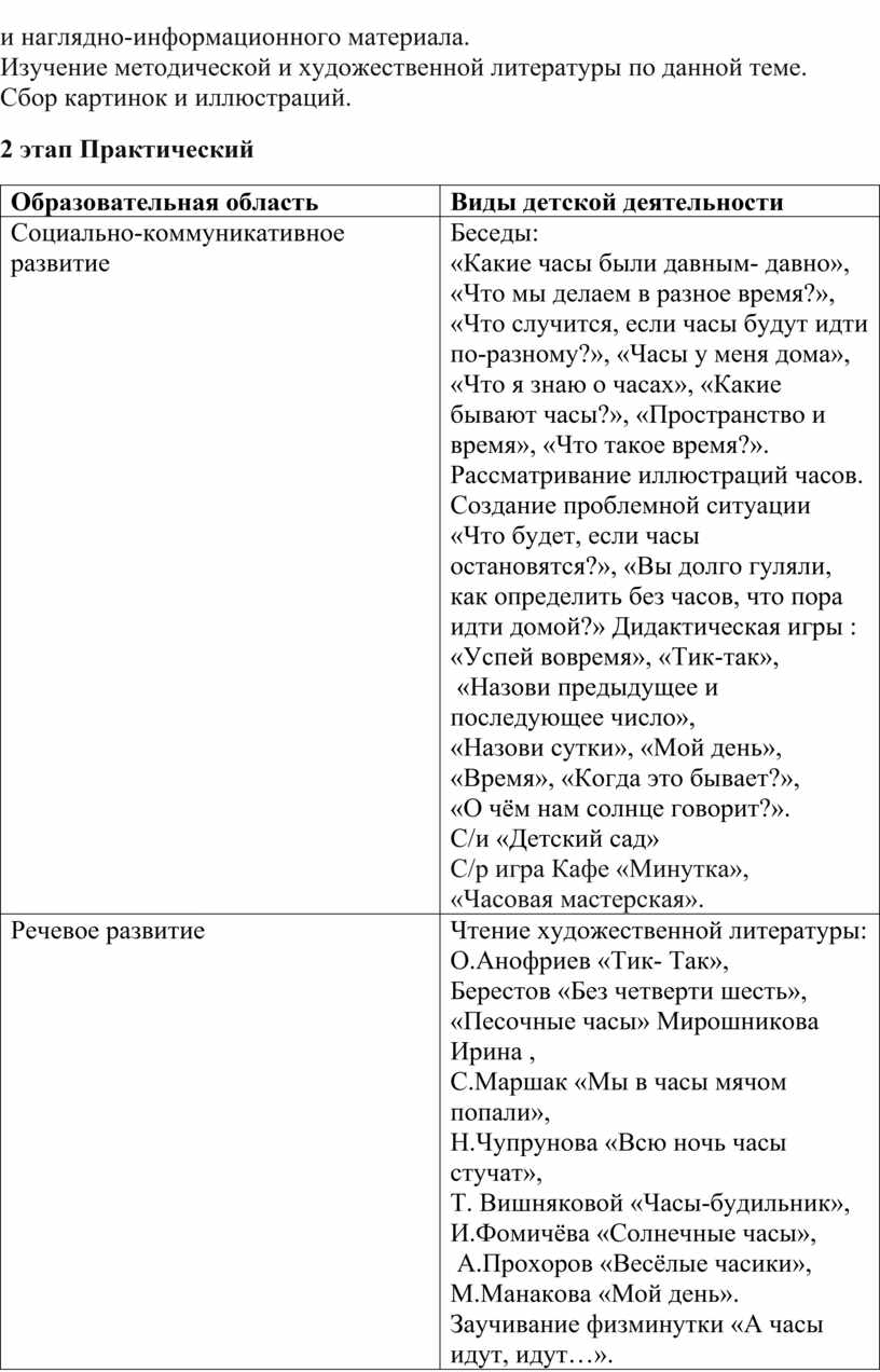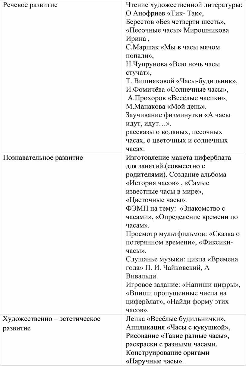 Чтение художественной литературы: О.Анофриев «Тик- Так», Берестов «Без четверти шесть», «Песочные часы» Мирошникова Ирина , С.Маршак «Мы в часы мячом попали», Н.Чупрунова «Всю ночь часы стучат», Т. Вишняковой «Часы-будильник», И.Фомичёва «Солнечные часы», А.Прохоров «Весёлые часики», М.Манакова «Мой день». Заучивание физминутки «А часы идут, идут…». рассказы о водяных, песочных часах, о цветочных и солнечных часах. |