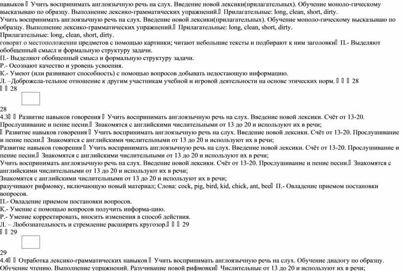 Учить воспринимать англоязычную речь на слух. Обучение чтению. Обучение монологическому высказыванию. Выполнение лексико-грамматических упражнений. |
