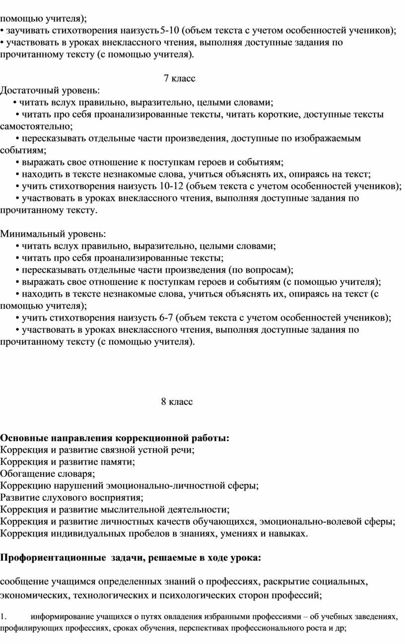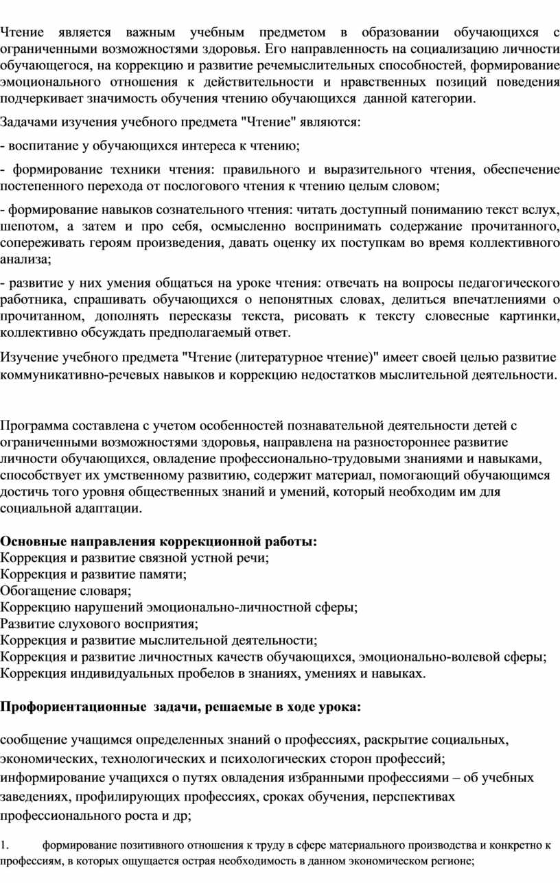 Изучение учебного предмета "Чтение (литературное чтение)" имеет своей целью развитие коммуникативно-речевых навыков и коррекцию недостатков мыслительной деятельности.