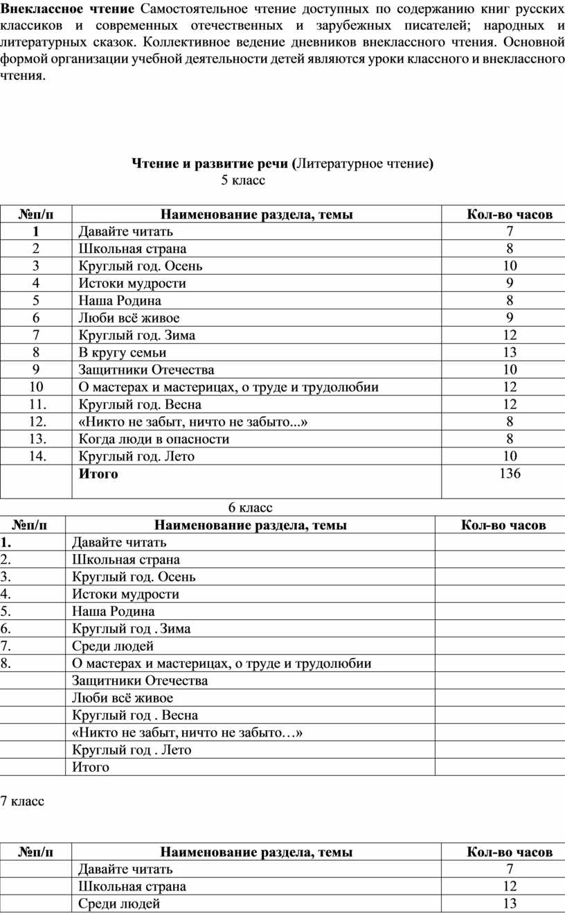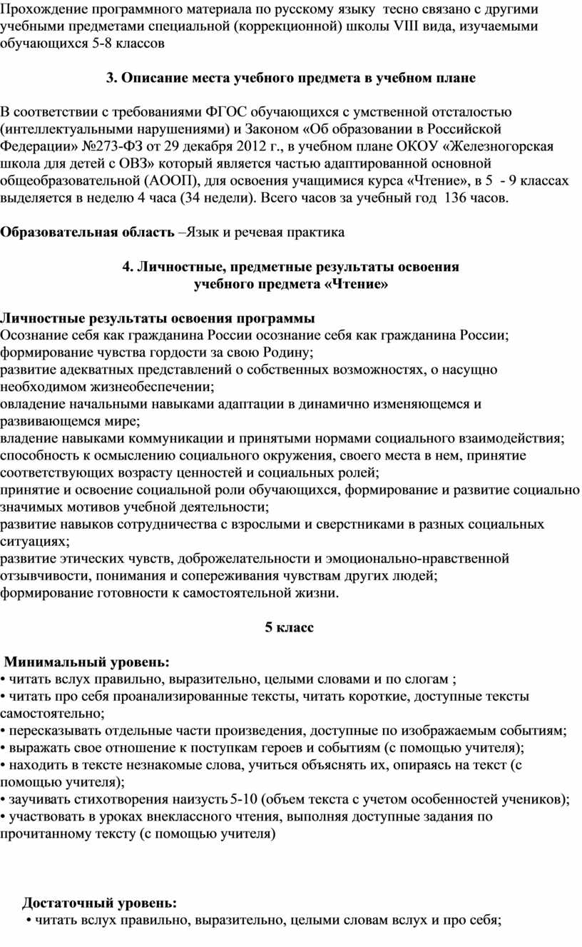 В соответствии с требованиями ФГОС обучающихся с умственной отсталостью (интеллектуальными нарушениями) и Законом «Об образовании в Российской Федерации» №273-ФЗ от 29 декабря 2012 г., в учебном плане ОКОУ «Железногорская школа для детей с ОВЗ» который является частью адаптированной основной общеобразовательной (АООП), для освоения учащимися курса «Чтение», в 5 - 9 классах выделяется в неделю 4 часа (34 недели). Всего часов за учебный год 136 часов.