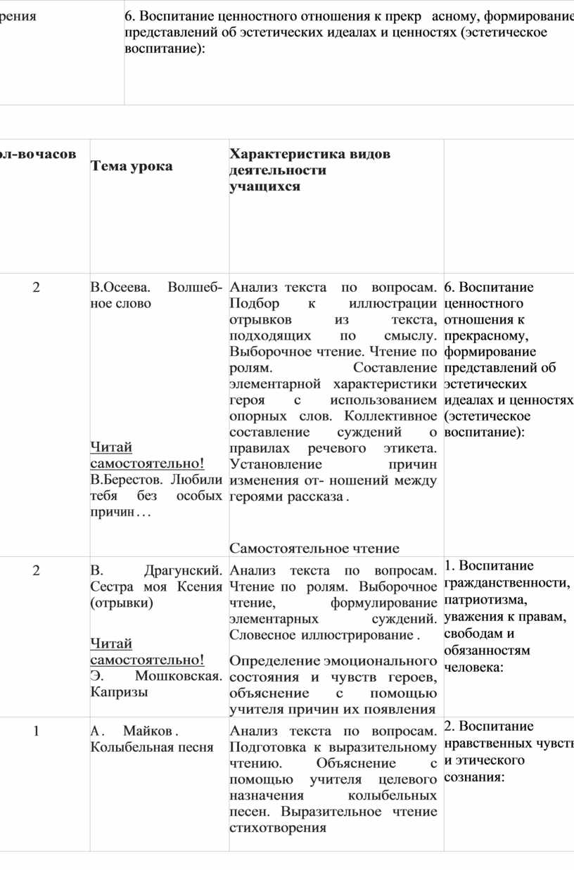 6. Воспитание ценностного отношения к прекрасному, формирование представлений об эстетических идеалах и ценностях (эстетическое воспитание):