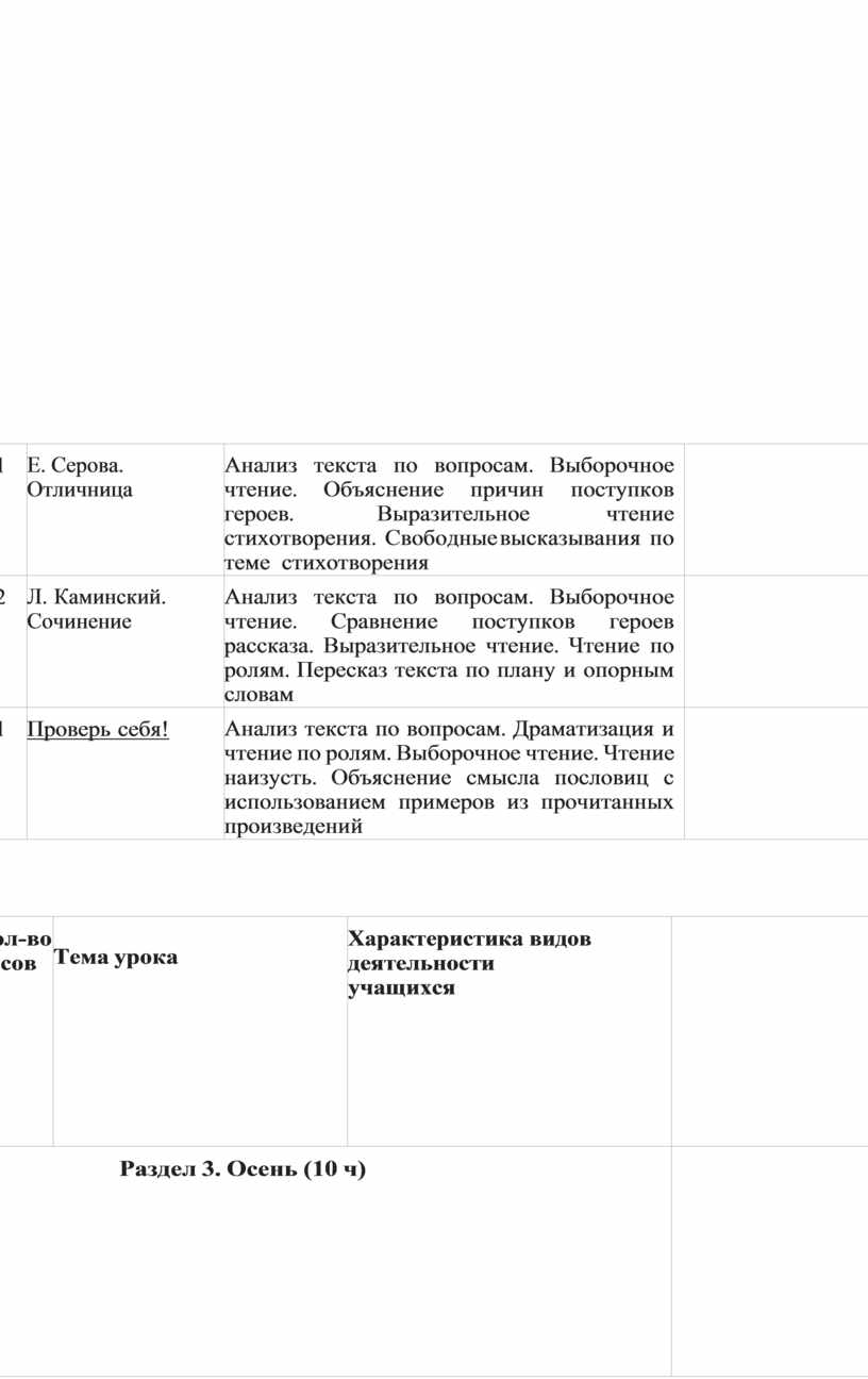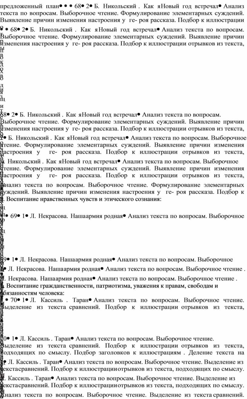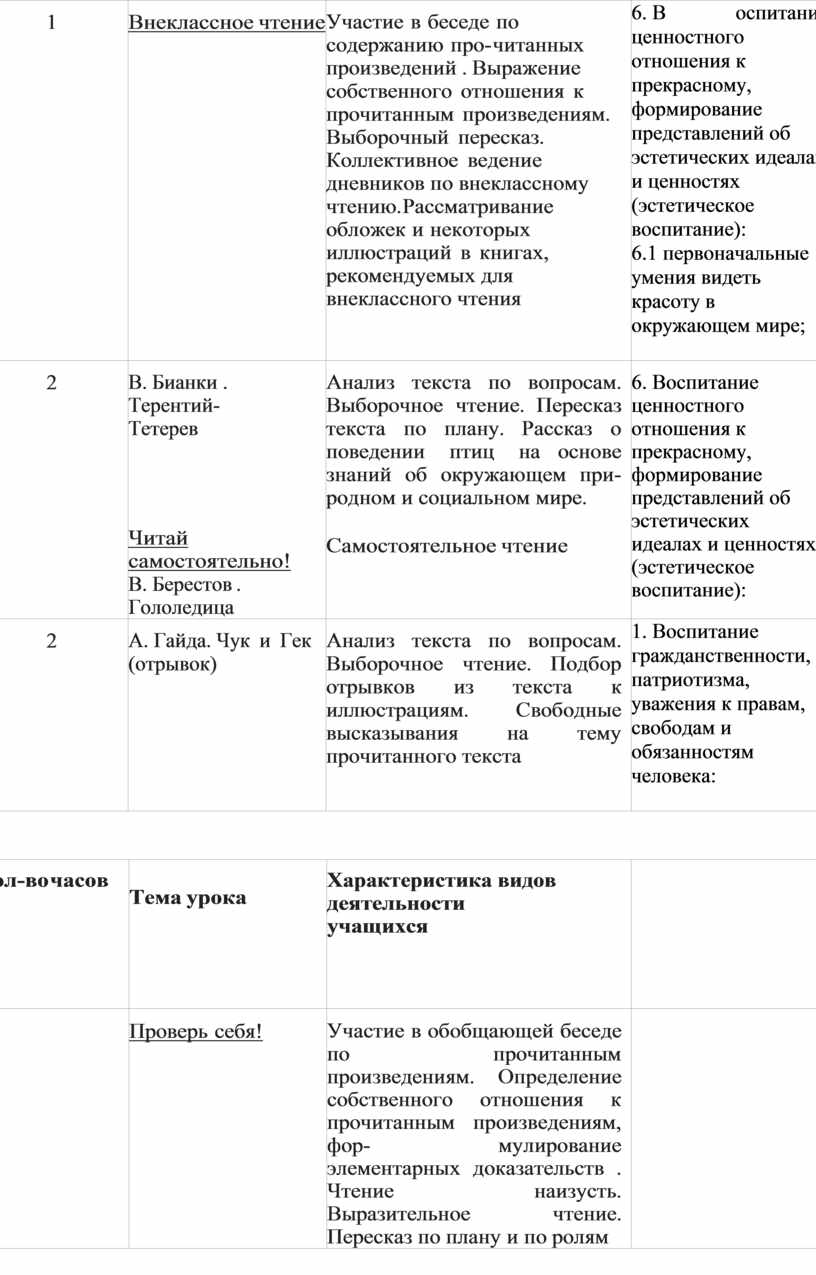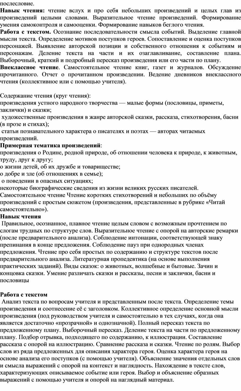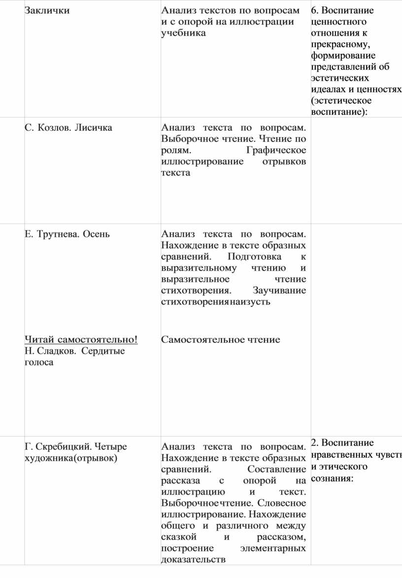Знакомство с творчеством писателей, наблюдение за особенностями языка .художественных произведений. Развитие навыка чтения, беседа по содержанию текстов. Воспитание интереса к чтению. Воспроизведение отрывков текста по иллюстрации. Подготовка к пересказу, составление рассказа по серии картинок в учебнике. Словарная работа. Развитие умения рассказывать последовательно, по плану. Совершенствование техники чтения.