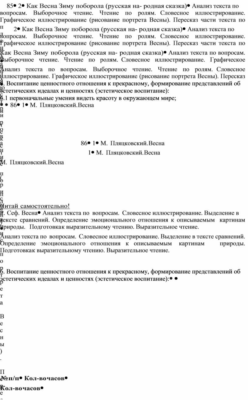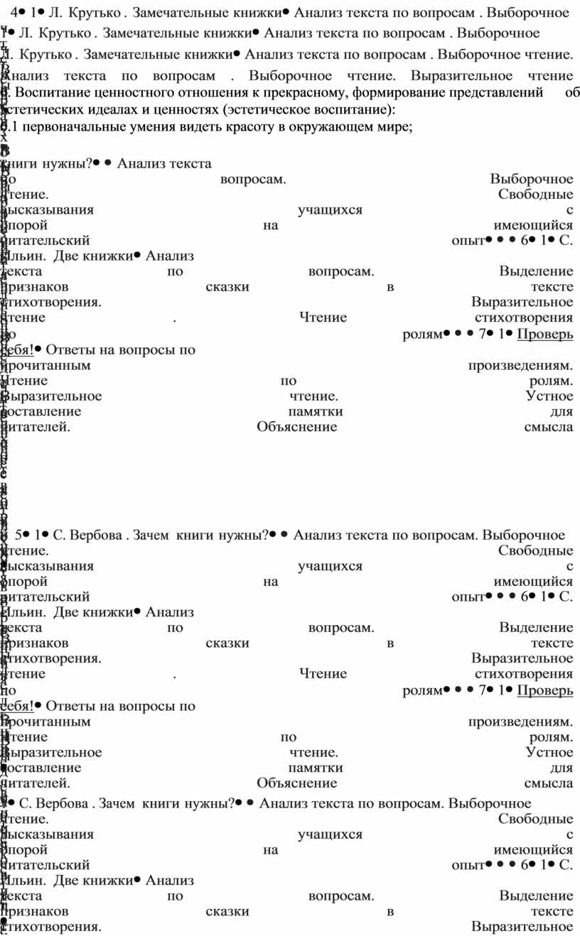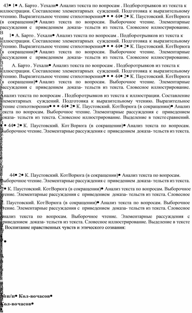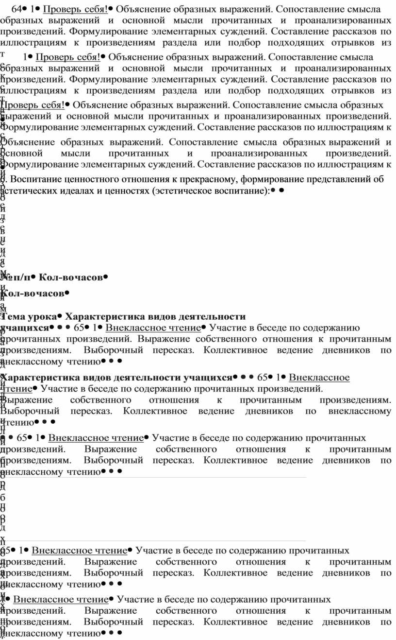 Знакомство с творчеством писателей, наблюдение за особенностями языка .художественных произведений. Развитие навыка чтения, беседа по содержанию текстов. Воспитание интереса к чтению. Воспроизведение отрывков текста по иллюстрации. Подготовка к пересказу, составление рассказа по серии картинок в учебнике. Словарная работа. Развитие умения рассказывать последовательно, по плану. Совершенствование техники чтения.