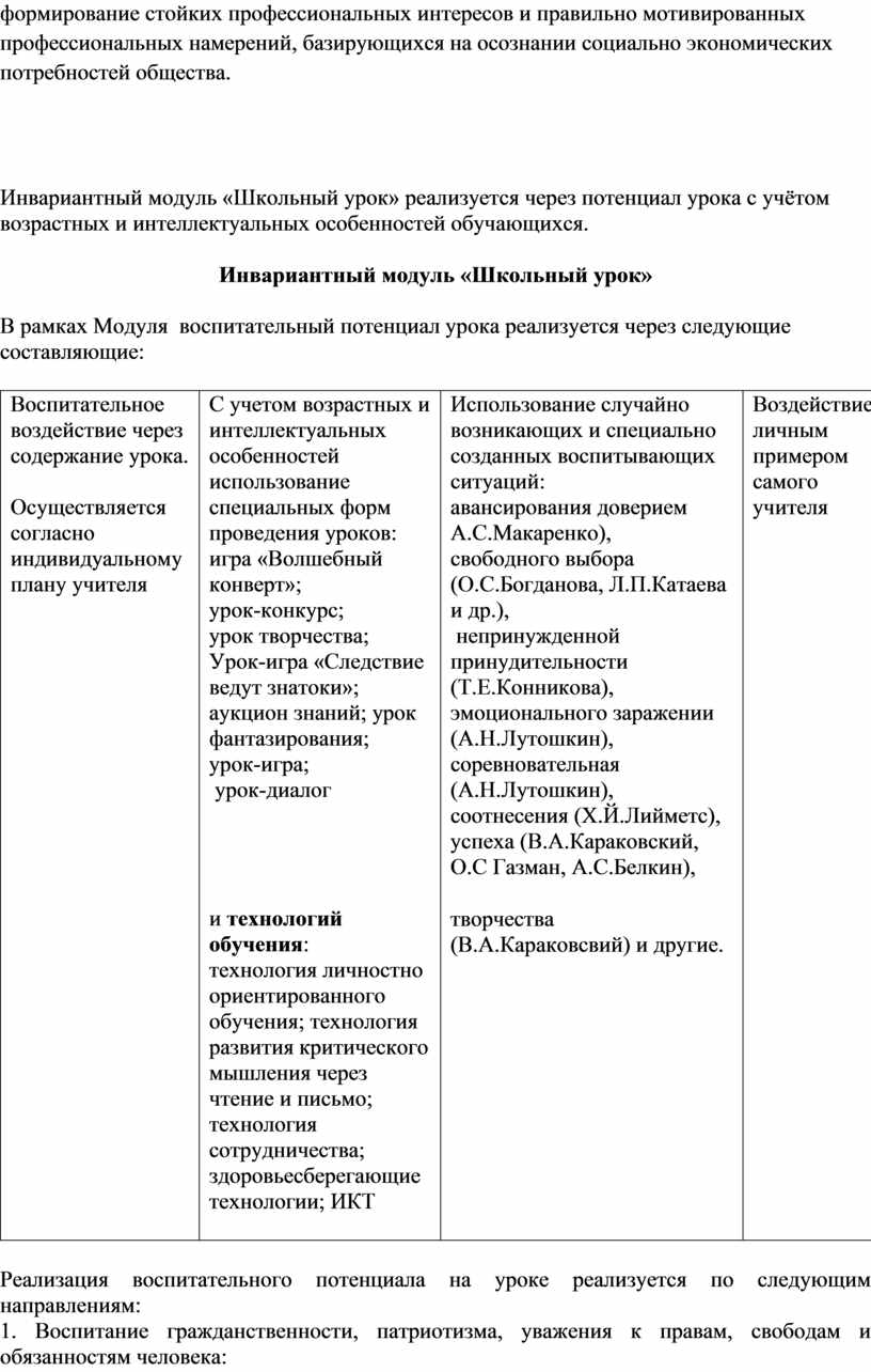 Инвариантный модуль «Школьный урок» реализуется через потенциал урока с учётом возрастных и интеллектуальных особенностей обучающихся.