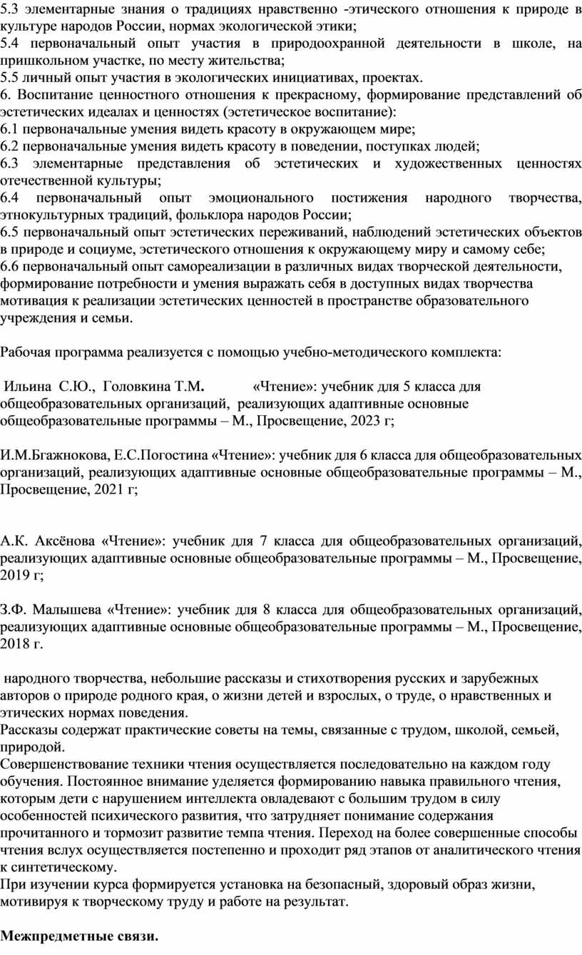 Ильина С.Ю., Головкина Т.М. «Чтение»: учебник для 5 класса для общеобразовательных организаций, реализующих адаптивные основные общеобразовательные программы – М., Просвещение, 2023 г;
