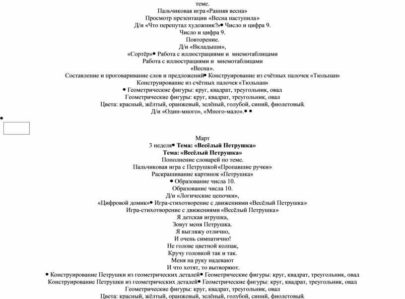 Тема: «Весна идёт» Пополнение словарей по теме. Пальчиковая игра «Ранняя весна» Просмотр презентации «Весна наступила» Д/и «Что перепутал художник?» |
