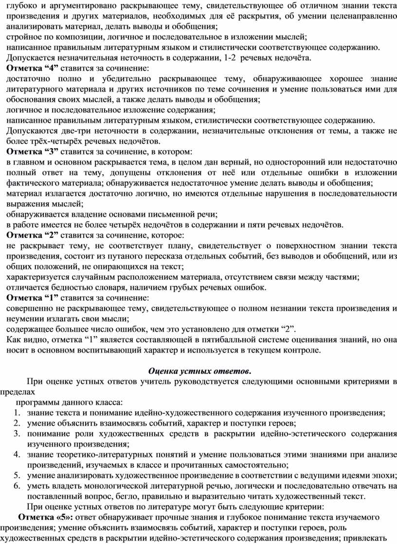 Отметка «5»: ответ обнаруживает прочные знания и глубокое понимание текста изучаемого произведения; умение объяснить взаимосвязь событий, характер и поступки героев, роль художественных средств в раскрытии идейно-эстетического содержания произведения; привлекать текст для аргументации своих выводов; раскрывать связь произведения с эпохой; свободно владеть монологической речью.