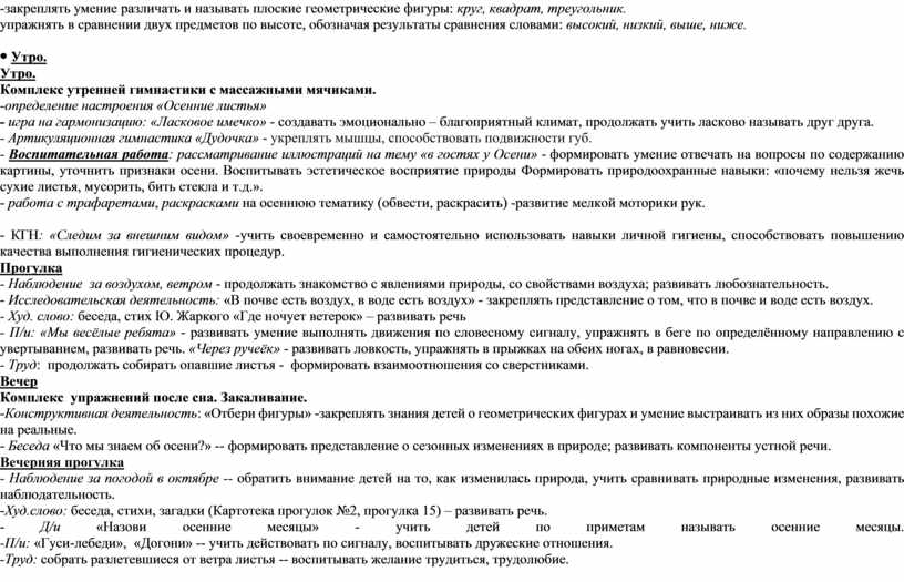 - КГН: «Следим за внешним видом» -учить своевременно и самостоятельно использовать навыки личной гигиены, способствовать повышению качества выполнения гигиенических процедур. Прогулка - Наблюдение за воздухом, ветром - продолжать знакомство с явлениями природы, со свойствами воздуха; развивать любознательность. - Исследовательская деятельность: «В почве есть воздух, в воде есть воздух» - закреплять представление о том, что в почве и воде есть воздух. - Худ. слово: беседа, стих Ю. Жаркого «Где ночует ветерок» – развивать речь - П/и: «Мы весёлые ребята» - развивать умение выполнять движения по словесному сигналу, упражнять в беге по определённому направлению с увертыванием, развивать речь. «Через ручеёк» - развивать ловкость, упражнять в прыжках на обеих ногах, в равновесии. - Труд: продолжать собирать опавшие листья - формировать взаимоотношения со сверстниками. Вечер Комплекс упражнений после сна. Закаливание. -Конструктивная деятельность: «Отбери фигуры» -закреплять знания детей о геометрических фигурах и умение выстраивать из них образы похожие на реальные. - Беседа «Что мы знаем об осени?» -- формировать представление о сезонных изменениях в природе; развивать компоненты устной речи. Вечерняя прогулка - Наблюдение за погодой в октябре -- обратить внимание детей на то, как изменилась природа, учить сравнивать природные изменения, развивать наблюдательность. -Худ.слово: беседа, стихи, загадки (Картотека прогулок №2, прогулка 15) – развивать речь. - Д/и «Назови осенние месяцы» -