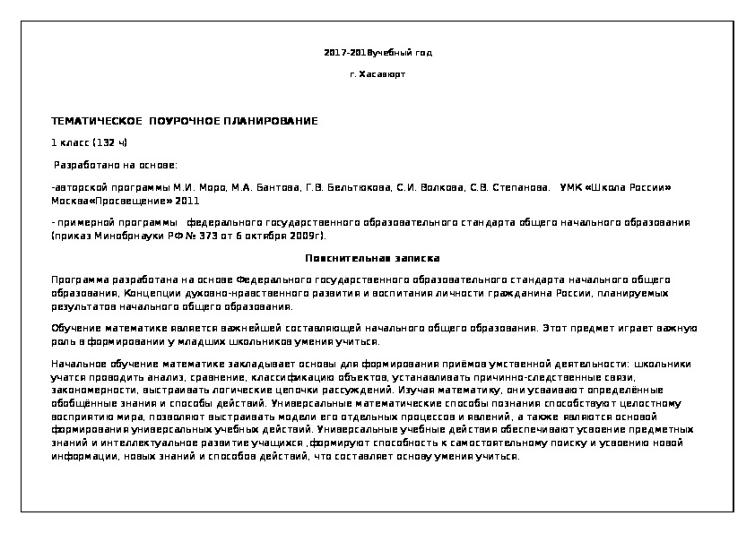 -авторской программы М.И. Моро, М.А. Бантова, Г.В. Бельтюкова, С.И. Волкова, С.В. Степанова. УМК «Школа России»