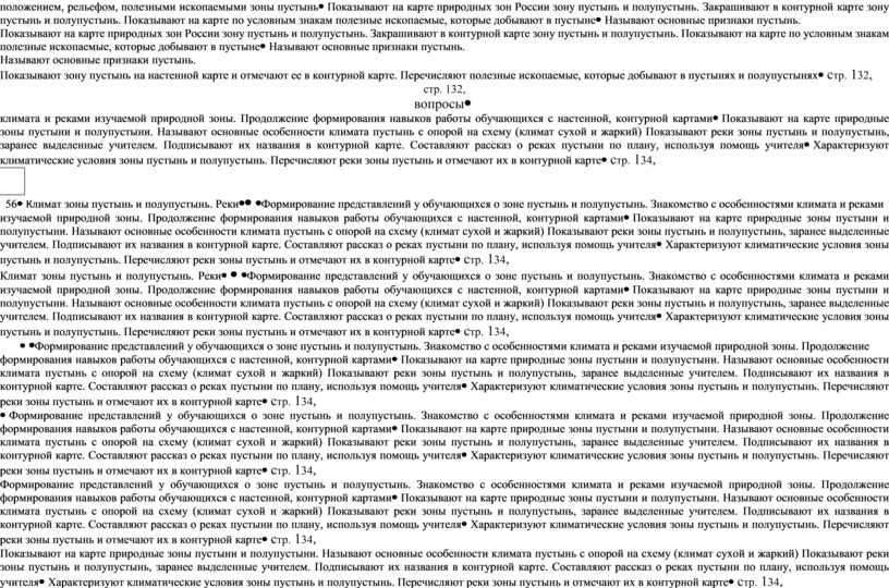 Формирование представлений у обучающихся о зоне пустынь и полупустынь. Знакомство с особенностями климата и реками изучаемой природной зоны. Продолжение формирования навыков работы обучающихся с настенной, контурной картами |