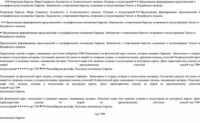 Продолжение формирования представлений о географическом положении Евразии. Знакомство с очертаниями берегов, островами и полуостровами Тихого и Индийского океанов. Закрепление знаний о морях, омывающих восточное побережье РФ |